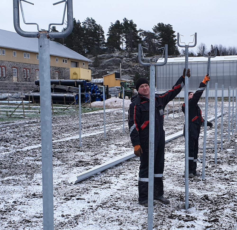 Kannatinhaarukka asennetaan Jarvenkylan blokkitunnelin kierretolppien (ruuvipaalujen) päälle kattokaaria ja sadevesikouruja varten.