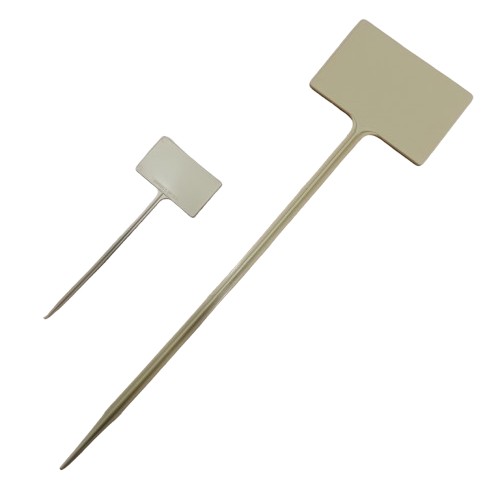 Muovinen merkintätikku rivien ja ruukkujen merkkaamiseen. Käytä vedenkestävää kynää. Tikkuun voi liimata myös tarran ja tikut voi pestä ja käyttää uudelleen.