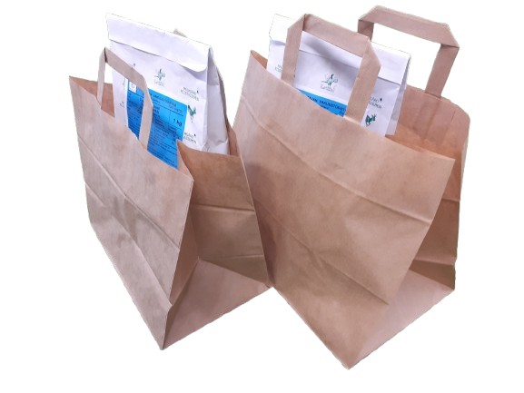 Kaksi erikokoista paperikassia, joissa sisällä kukkasiemenpakkaukset