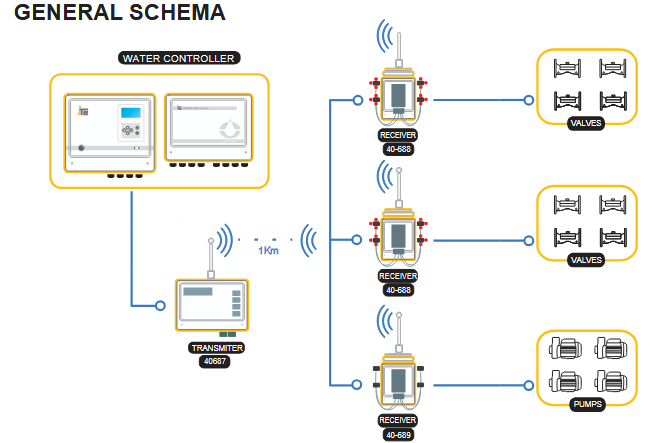 Radiomoduuli mahdollistaa pitkän kantaman langattoman ohjauksen Water Controller 3000 -ohjaimen 12 ulostulolle. Laite kytketään kasteluohjaimen 24 VAC -ulostuloihin, ja radion kautta se lähettää signaalin kentällä oleville vastaanottimille. Vastaanottimet voivat ohjata joko solenoidiventtiilejä tai lukittuvia releitä vesipumppujen käynnistyksessä.