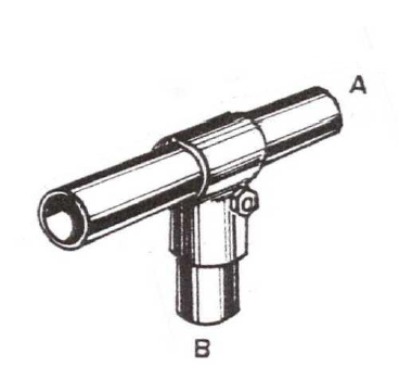 Galvanoitu T-liitin putkikiinnike kahdelle eri kokoiselle putkelle.
