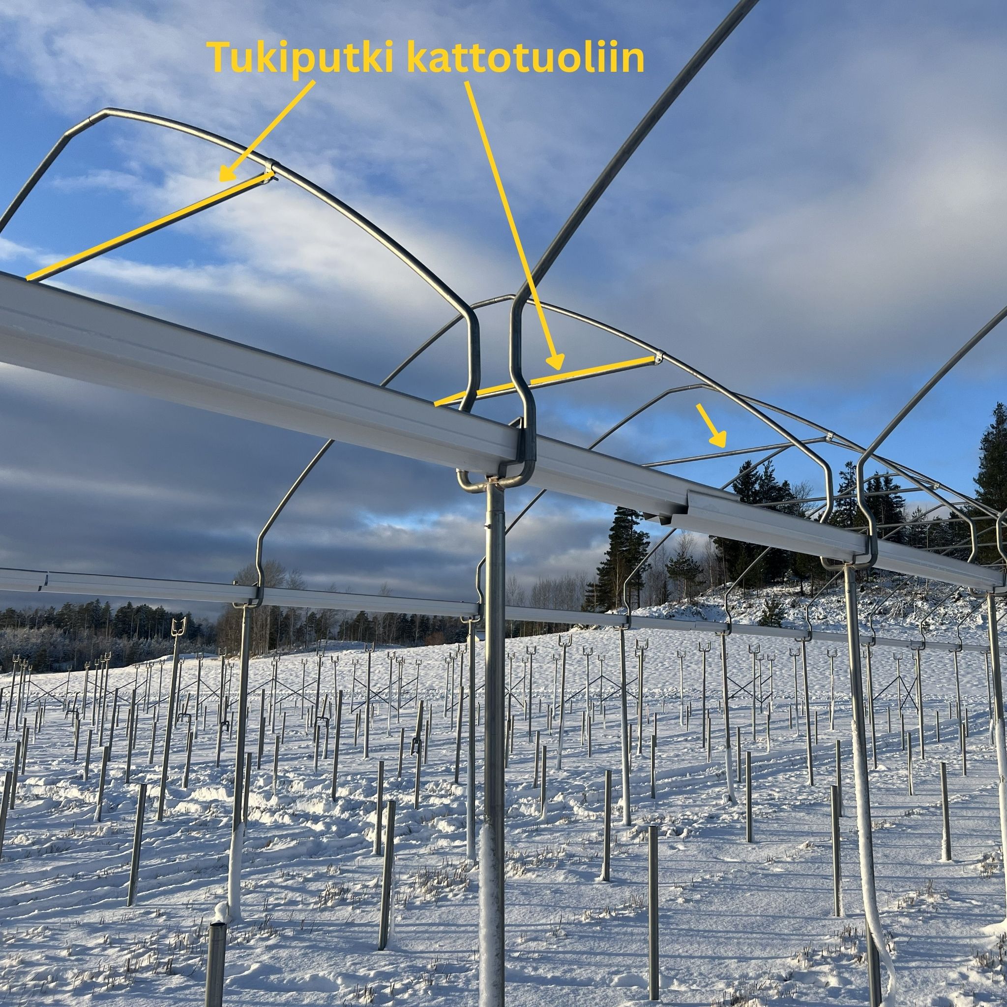 Blokkitunnelin kaarikehät muodostetaan kolmesta osasta. Uroskaari + naaraskaari ja väliin kattotuolituki. Kattotuolin tukiputki kiinnitetään kaareen putkikiinnikkeellä.