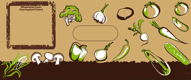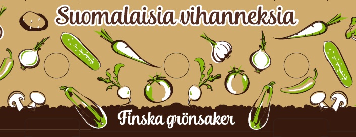 Yleisvihanneslaatikko ruskealla pohjalla ja vihanneskuvioinnilla.